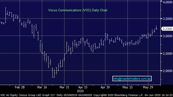 Vocus (VOC) +2.88%: tightened guidance today for the full year result, lowering the top end of the EBITDA guidance for a range of $359-369m. The market was already looking for $365m, around the mid-point of the revised guidance so not too much to change for the analysts there. The telco also reworked their debt, moving out their maturity profile with an average term of 3.5 years providing a little more balance sheet flexibility. They also managed to ease debt covenant restrictions to a maximum of 3.25x net debt to EBITDA. Currently running at around 2.8x, Vocus is clearly heavily leveraged but it looks to be making the right moves in terms of de-risking while maintaining earnings growth. The new set up shows confidence from the lenders, giving the telco the set up to take on the next phase of growth.