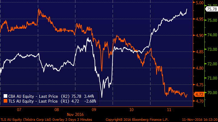 The other interesting aspect as we’ve spoken of recently is the sectors/ stocks / investment themes that will struggle. The yield play will likely come under pressure and we’ve seen this play out already – but there was another obvious leg down this week. If we look at the chart of CBA versus Telstra (TLS) over the last 5 days, the trends become fairly obvious. Since trump was elected, Financials have rocketed and the yield trade has suffered – about a 6% variance in the performance of TLS v CBA. It will be extremely important going forward to be in the right sectors. It seems to us that investment markets, although positive this week are about to head into a very tricky period and we’ll need to be more active to generate performance.