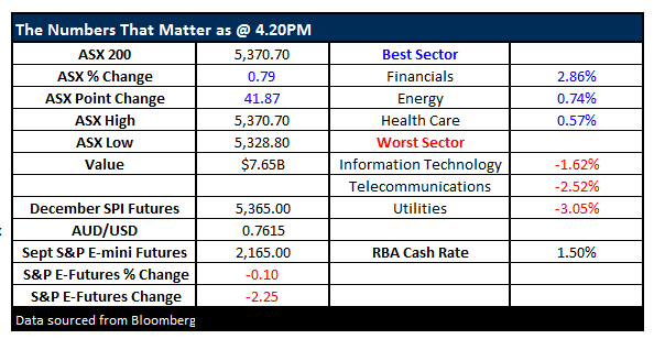 On our market today, we had a more subdued session with a range of +/- 37 points, a high of 5370, a low of 5333 and a close of 5370, up +41pts or +0.79%. Again, BIG value day on the ASX with $7.65bn