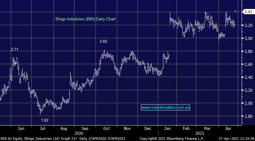 BIN +6%: Shares in waste management company Bingo (BIN) are leading the gainers, trading 6% better today on the backdrop of a weak market. The company has been under taker over from Macquarie’s infrastructure arm MIRA since early in the year with the deal finally looking to wrap up. Holders will have the option of either $3.45/share in cash or a mix of $1.32/share in cash plus a share in the new unlisted entity. Back in January when the deal was announced it represented a 26% premium to market, now shares trade at just a 1.4% discount with plenty of shareholders happy to take the cash on market and run.
