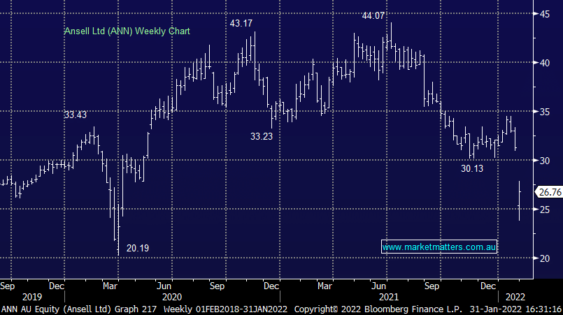 ANN -14.34%: the healthcare and industrials supplies company was smacked to 18+ month lows today after it flagged a number of issues leading into the half year result. Sales for the half are expected to jump ~7% to $US1,009m however a big jump in costs will weigh on margins with profit to take a ~25% hit. They noted supply chain disruptions, forced manufacturing shutdowns due to COVID outbreaks and higher input costs have weighed on the half while also seeing a slowdown in demand as customers look to draw down inventory. News US customs have also held a shipment of medical gloves following allegations of forced labour at a third party production facility also shocked the market. Ansell is working to clear the allegations however it’s another pain point in a tough half. A knife was taken to full year earnings guidance given the pressures facing the business, revised 27% lower to $US1.25-1.45.